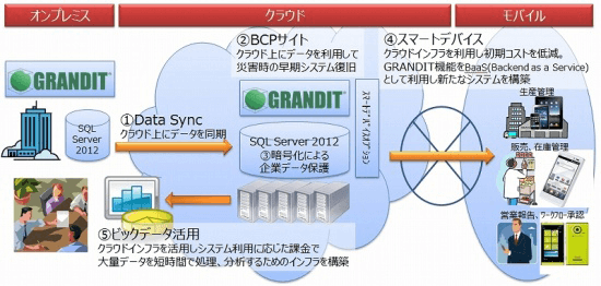 クラウドへの対応も、GRANDIT 2.0の強化ポイントのひとつだが、これに関し、高橋は次のように語っている。 「クラウドに関しては、じつは昨年、『GRANDIT BCPソリューション』というオンプレミスとクラウドの連携ソリューションを先行提供しています。これは、オンプレミスの基幹システムとクラウドサービスを融合し、通常時は安価なデータバックアップとして利用し、災害時にクラウドサービスを利用した早期復旧を実現するソリューションです。また、今後はBCPにとどまらないソリューションの提供も考えています。たとえば、クラウド上のデータをスマートデバイスで活用したり、クラウドインフラを利用して大量データを短時間で処理したりするビッグデータソリューションも検討しています」