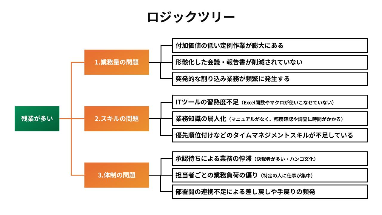 複雑な課題を論理的に分解し、根本原因を特定するための手法がロジックツリーです。目に見える事象(枝葉)だけに対処しても、根底にある問題を解消しなければ再発を繰り返すため、構造的な整理が不可欠です。