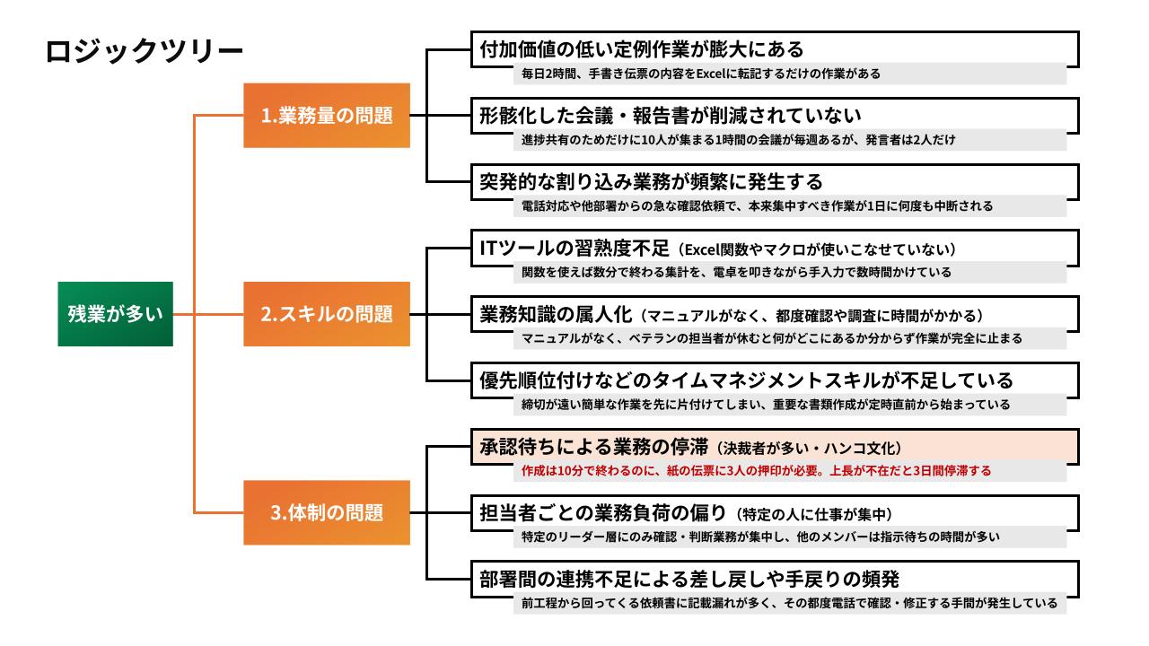 調査を踏まえて「残業が多い」の要因を分析すると、実作業は10分で終わるのに「上長の承認待ち」で3日間停滞しているといった状況が見えてきたとします。