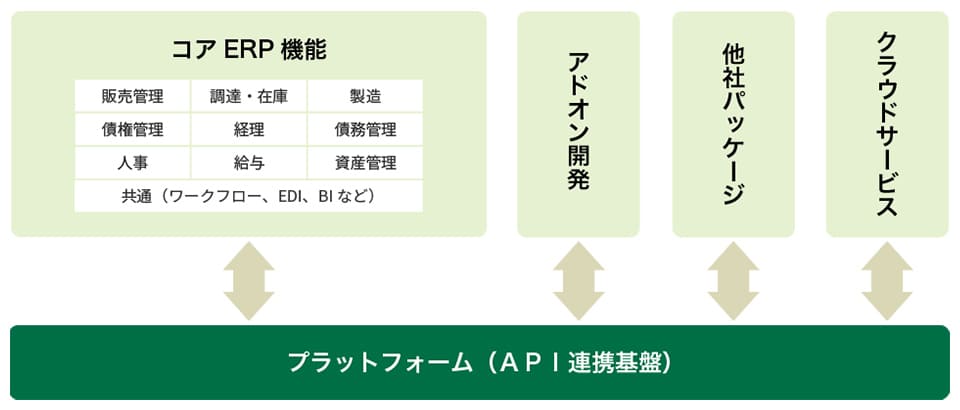 | 最適なシステム構築 | 段階的に導入しても最終型はERPとして機能する。導入ベンダーが提供する、業種や業態に合わせた最適な機能モジュールを選択できるため、自社に最適なシステムを構築できる。 |