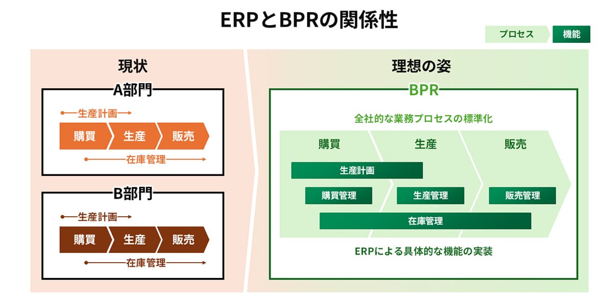 BPRで描いた改革後の業務プロセスを実現するための具体的な実施手段がERPであり、ERPはその基盤として機能します。