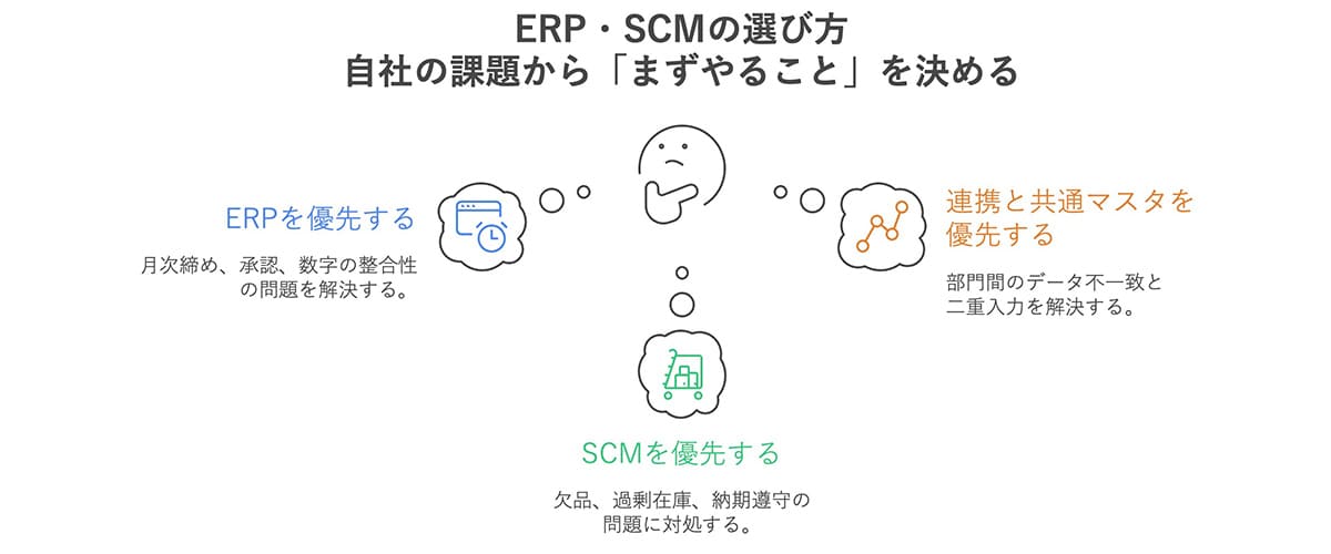 ERP・SCMの選び方のシンプルです。いま直面している最重要課題を、まずは1〜2個のKPIに落とし込みます。次に、そのKPIを最短で改善できる領域(ERP/SCM/連携・共通マスタ)から着手します。判断に迷うときは、短期間で変化が出やすい領域を起点にしましょう。どんな症状なら「ERP・SCM・連携のどれを先に手当てするべきか」を、以下に具体的に示していきます。