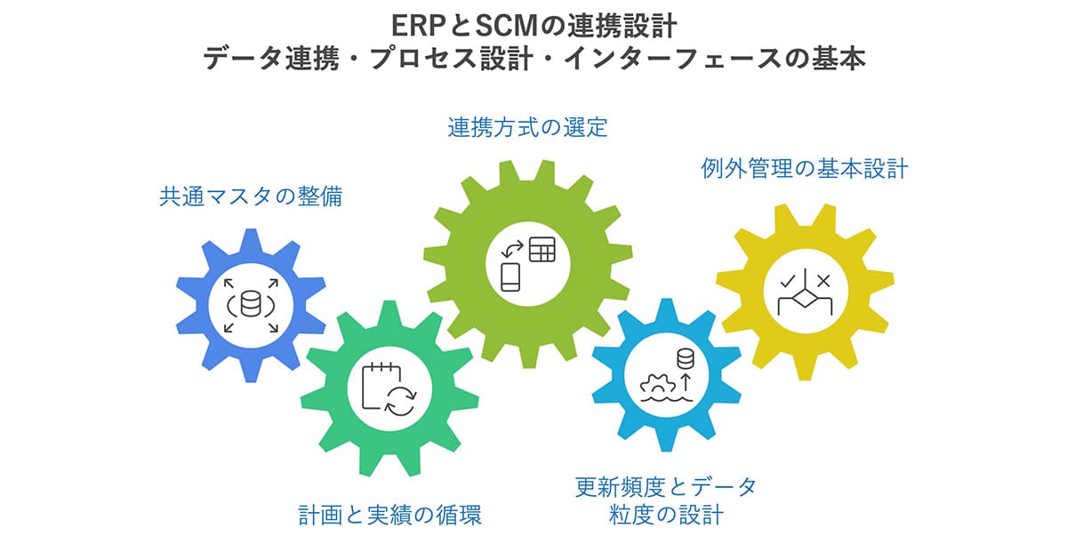 ERPとSCMの着手先が定まったら、次は「どうつなぐか」を決めます。成果を安定させる鍵は、受け渡すデータの範囲と単位、更新頻度、不具合時の対処を事前にシンプルなルールとして合意しておくことです。ここでは、共通マスタの整合、受け渡し設計、例外対応まで、最低限そろえるべき要点を整理します。