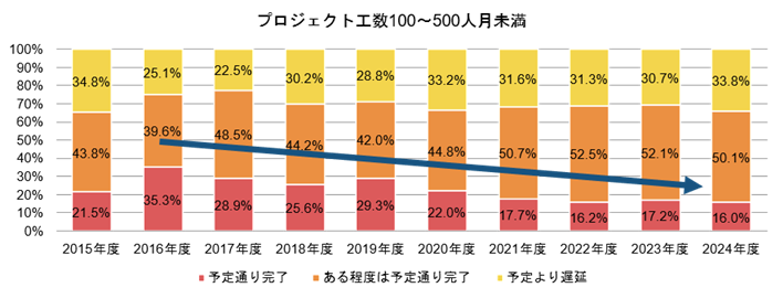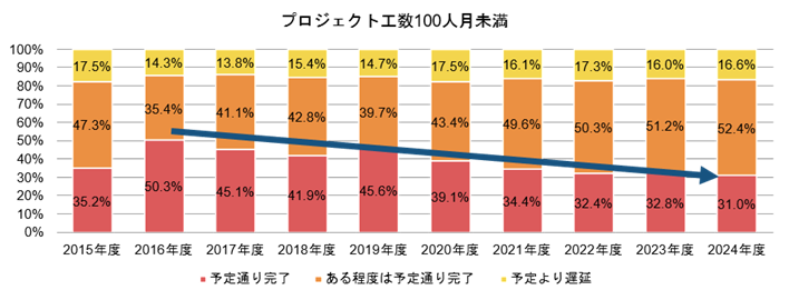 (図1)システム開発プロジェクトにおける工期遵守状況変遷(2015年度~2024年度)