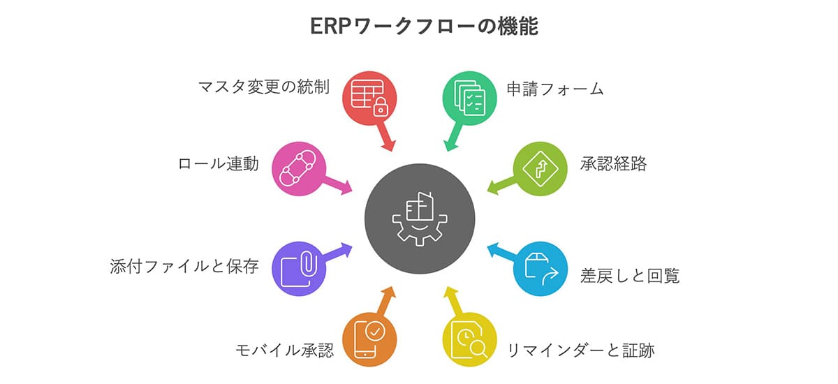 | ERPワークフロー | 申請→承認→台帳反映を一貫管理 | 最終承認で自動反映/証跡を一元管理 | 分岐は最小限/金額基準・職務分離を設計 |