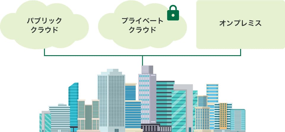 ハイブリッドクラウドとは、オンプレミス、パブリッククラウド、プライベートクラウドなど、複数のコンピューティング環境を組み合わせて利用するクラウドシステムで、各環境の強みと弱みを補完し合い、自社に最適なITインフラ環境を実現することができます。