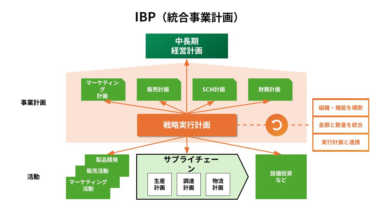 IBPは「統合事業計画」とも呼ばれ、経営戦略・財務計画・各部門(販売、製造、調達など)の業務計画をひとつのプロセスに統合し、全社の利益と企業価値の最大化を目指す経営管理手法です。