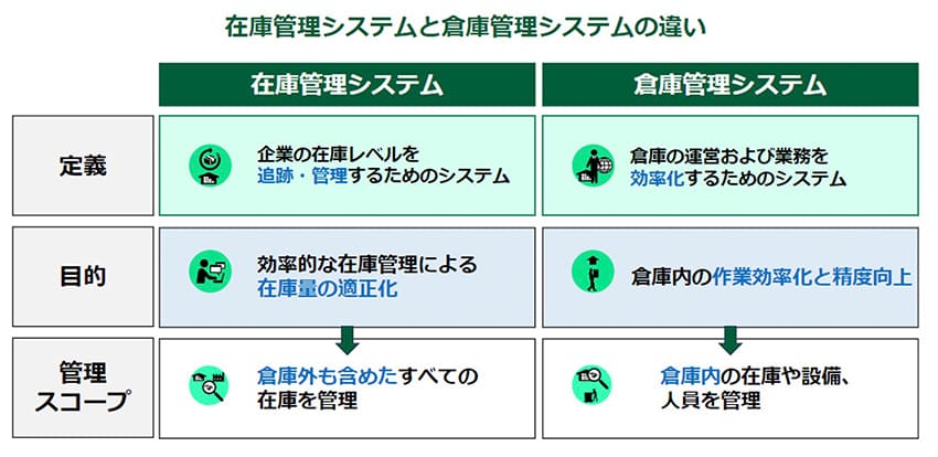 在庫管理システムと混同されやすいシステムとして、倉庫管理システム(WMS:Warehouse Management System)があります。在庫管理システムと倉庫管理システムは、どちらも在庫管理を扱う点では同様ですが、両者の違いはシステムの目的や機能の範囲です。