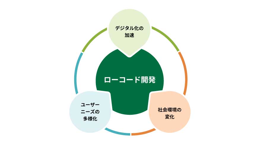 デジタルトランスフォーメーション(DX)が叫ばれる中、企業はますますデジタル化を進めることが求められています。しかし、労働人口減少といった社会的課題はIT業界にも押し寄せており、IT人材の不足や開発コストの高騰が、その実現を阻む大きな障壁となっていました。加えて、近年のスマホアプリなどの利用により、ユーザーのニーズは高度化、多様化しています。ローコード開発は、こうした課題を解決し、短期間で多様なアプリケーションを開発することに役立ちます。
