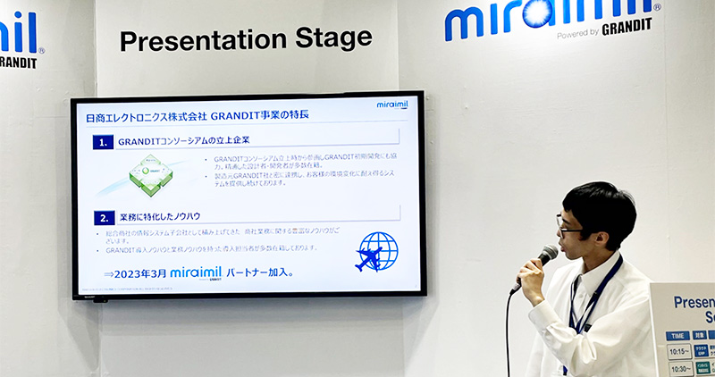日商エレクトロニクス株式会社のプレゼンでは庄野氏が登壇し、商社・卸売業様向けのクラウドERP×貿易DXサービスを紹介しました。日商エレクトロニクス株式会社は、GRANDITコンソーシアムの立ち上げ期から参画している企業であり、初期開発から参加しているだけでなく、同社もGRANDITユーザーとして、ノウハウを蓄積しています。2023年3月からクラウドサービス型の「GRANDIT miraimil」についてもパートナーとなりました。