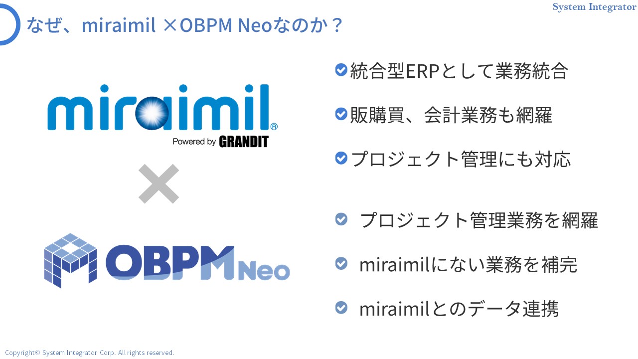 プロジェクトのコスト管理以外の領域まで管理したい場合は、GRANDIT miraimilに「OBPM Neo」をあわせて活用してほしいと締めくくりました。