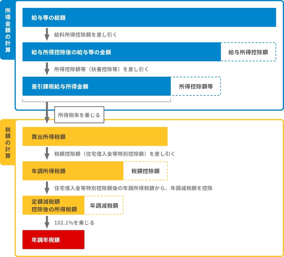 年末調整における年調減税額の控除は、住宅借入⾦等特別控除後の所得税額(年調所得税額)から、その住宅借入⾦等特別控除後の所得税額を限度に⾏います。具体的には以下の図を参照下さい。
