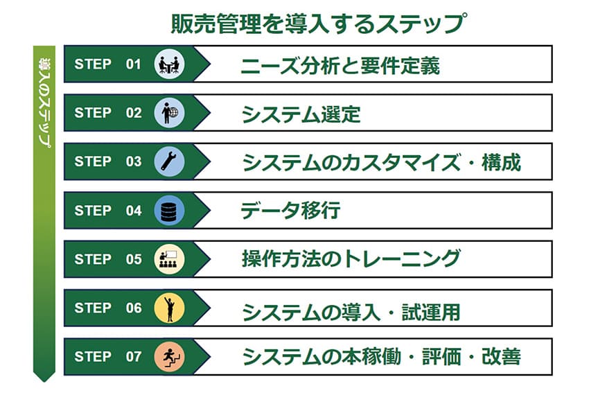 この章では、販売管理システムを導入するステップについて解説します。企業で販売管理システムを導入・運用する際には、以下のステップで進めていきましょう。