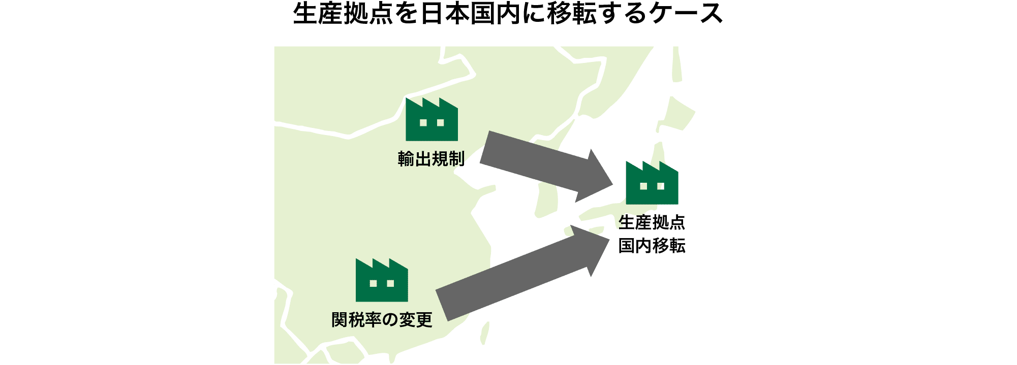 | 米国内、関税率の低い地域からの調達・供給 | 米国内やFTA締結国など、関税率の低い地域に生産拠点を持つ他社から製品の供給を受けることで、関税コストを回避できます。 |