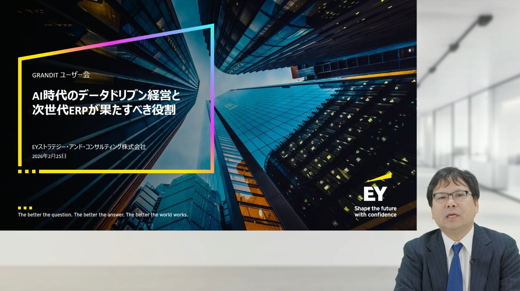 基調講演には、EYストラテジー・アンド・コンサルティング株式会社 テクノロジーコンサルティング ソリューションセールスリーダー パートナーの梶浦英亮氏が登壇されました。ERP領域で約30年にわたる豊富な経験を持ち、大規模な業務改革プロジェクトを国内外で数多く手がけてこられた専門家です。