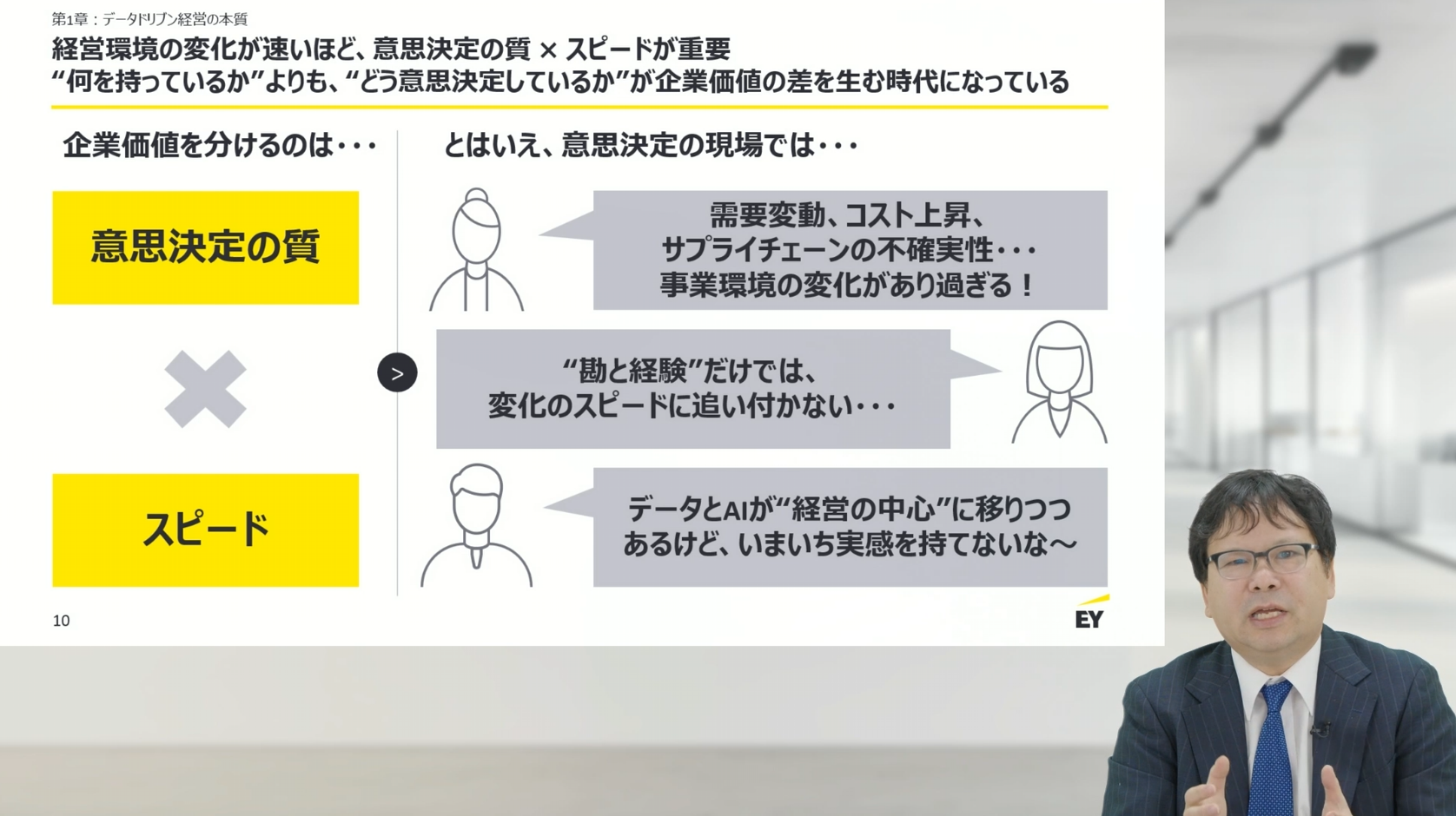 梶浦氏はまず、企業価値を分けるのは「何を持っているか」ではなく「どう意思決定しているか」であると指摘しました。市場環境の変化が激しさを増す中で、経営に求められるのは意思決定の質とスピードの両立です。