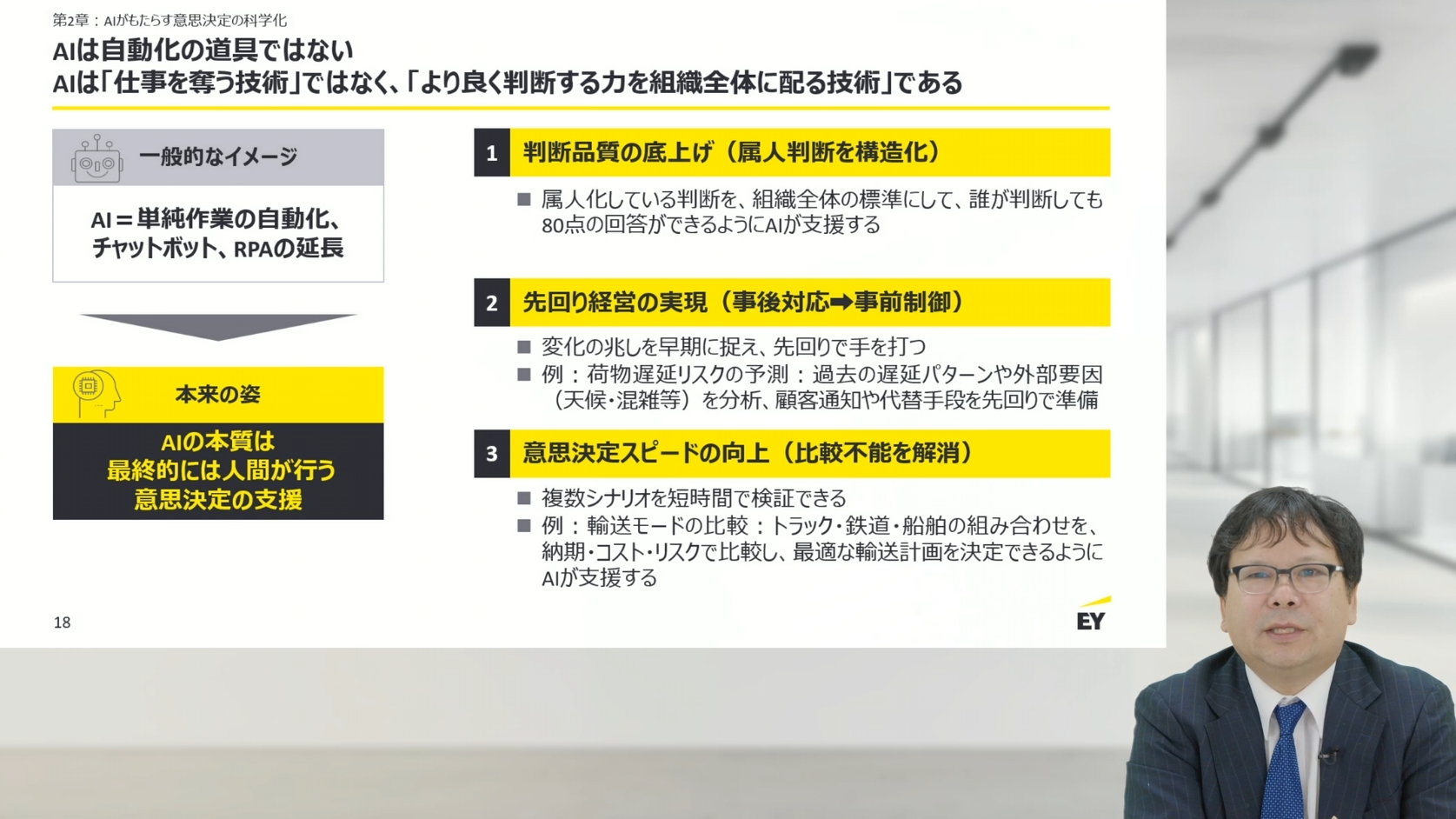 梶浦氏は、AIは単なる自動化ツールではなく、「より良く判断する力を組織全体に波及させる技術」であると位置づけます。熟練者の勘と経験を形式知へと変換し、誰もが一定水準の判断を行えるようにすることこそ、AIの本質的価値です。