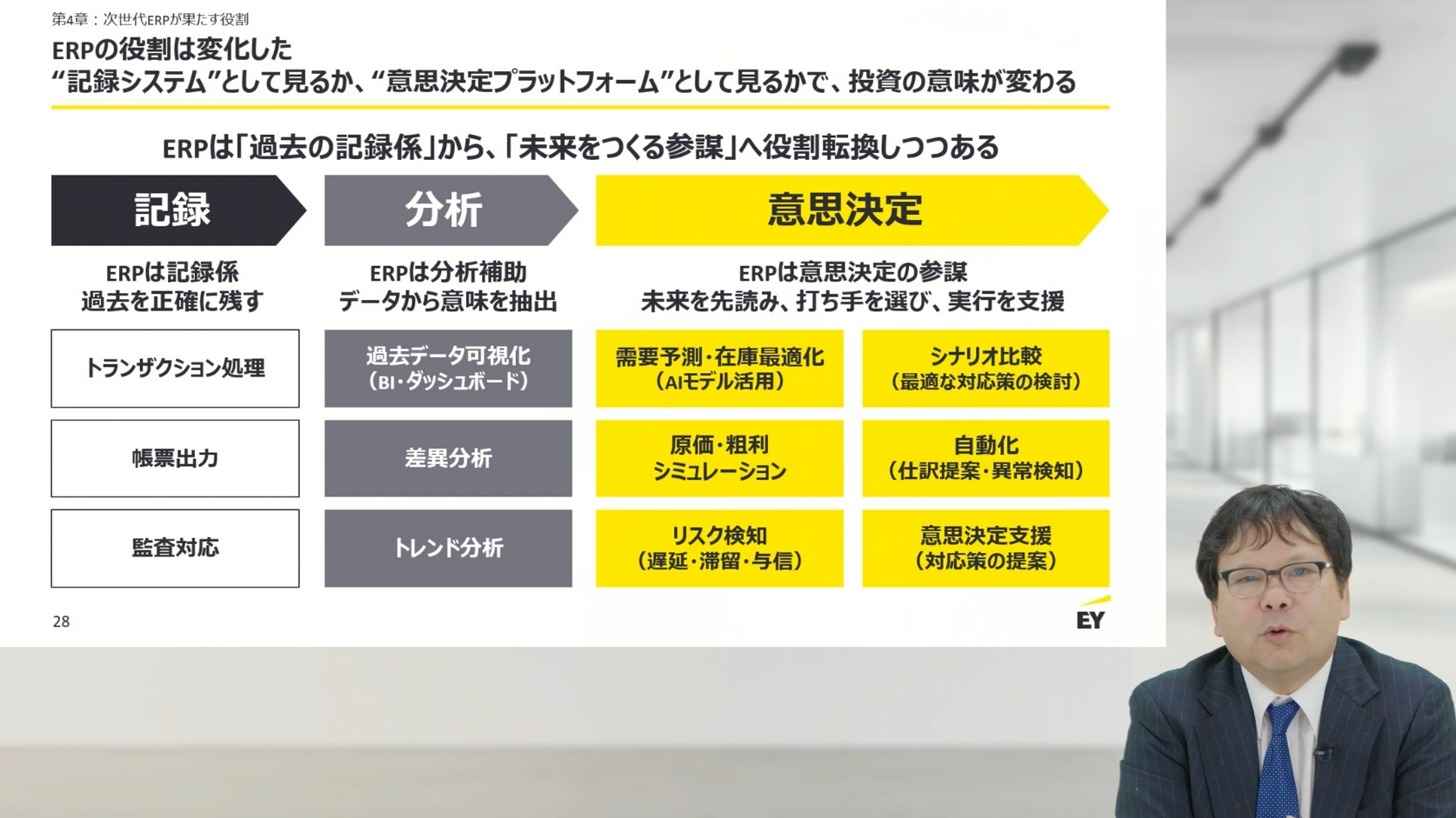講演後半では、ERPの役割転換について語られました。ERPはもはや「過去を記録するシステム」ではなく、「未来をつくる参謀」へと進化しつつあります。