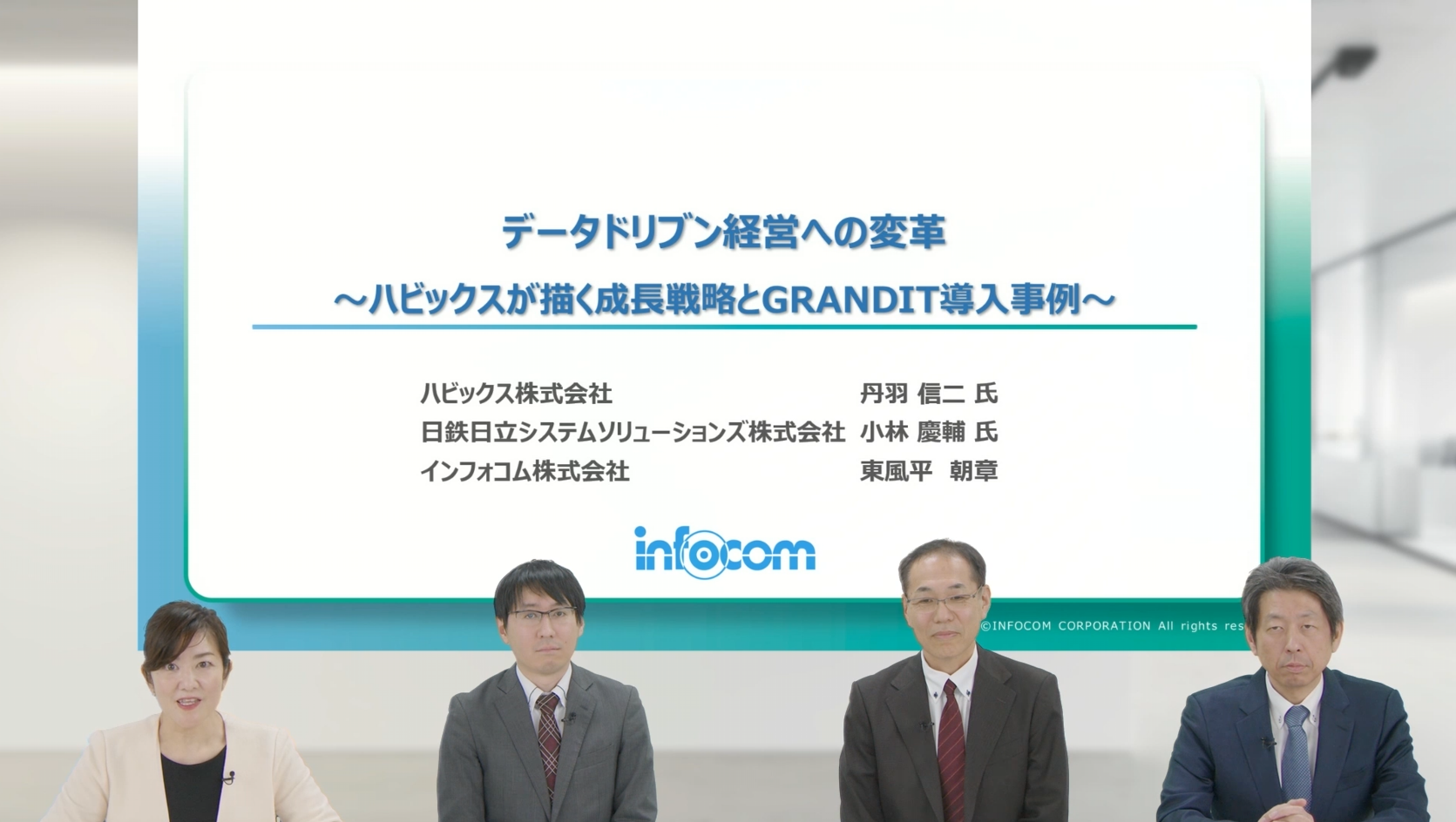 本セッションでは、「データドリブン経営への変革 ~ハビックスが描く成長戦略とGRANDIT導入事例」と題し、ハビックス株式会社の丹羽信二氏、導入パートナーである日鉄日立システムソリューションズ株式会社の小林慶輔氏、そしてメーカー代表としてインフォコム株式会社東風平朝章が登壇しました。