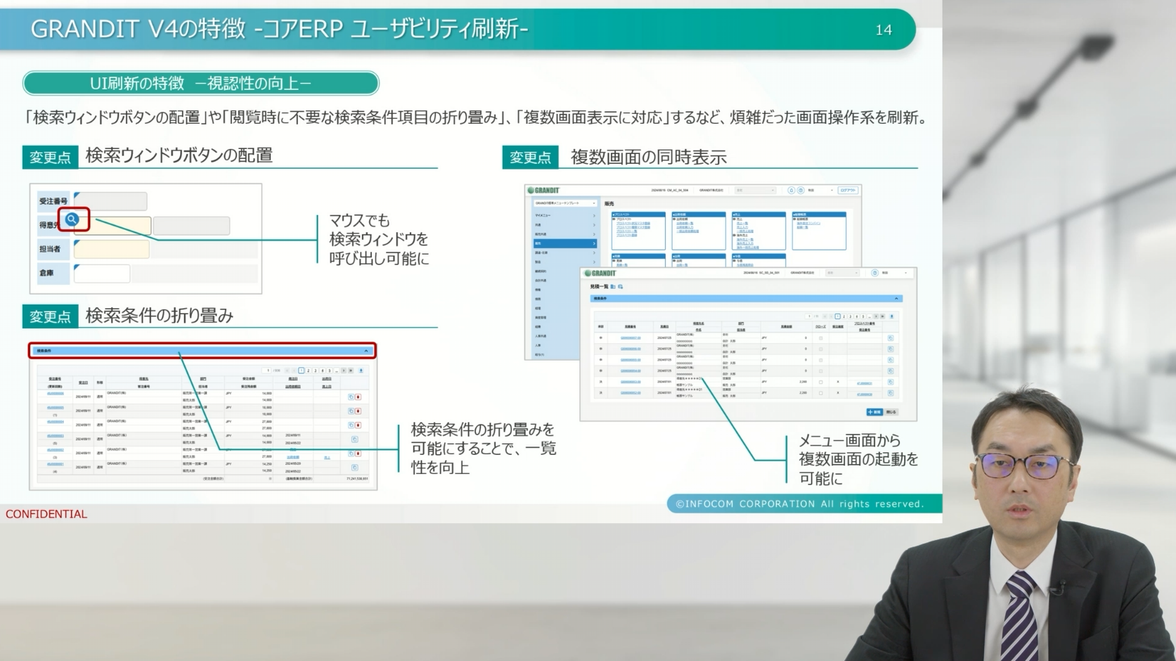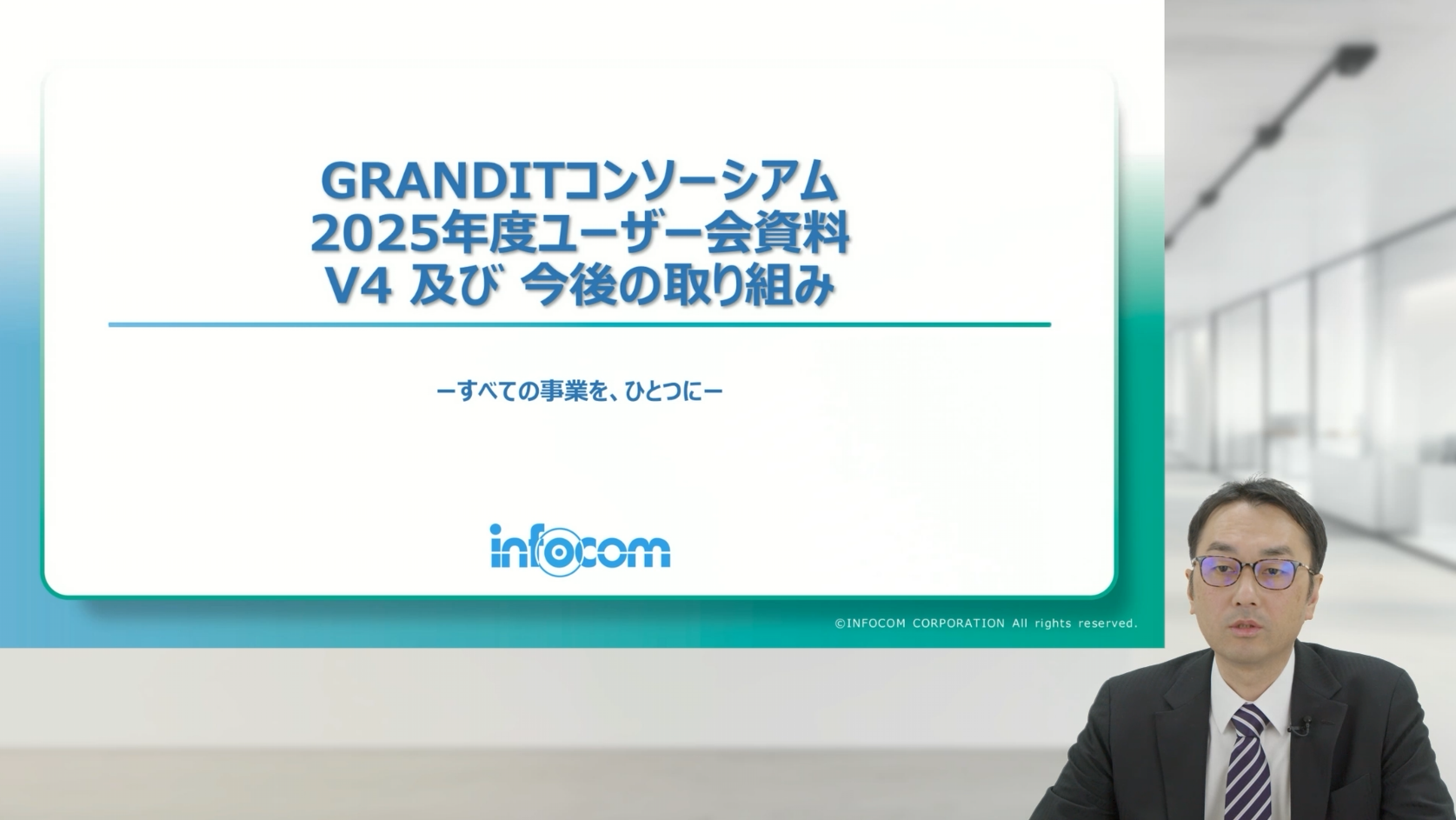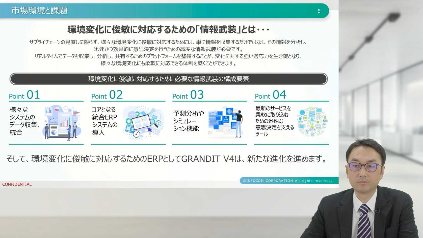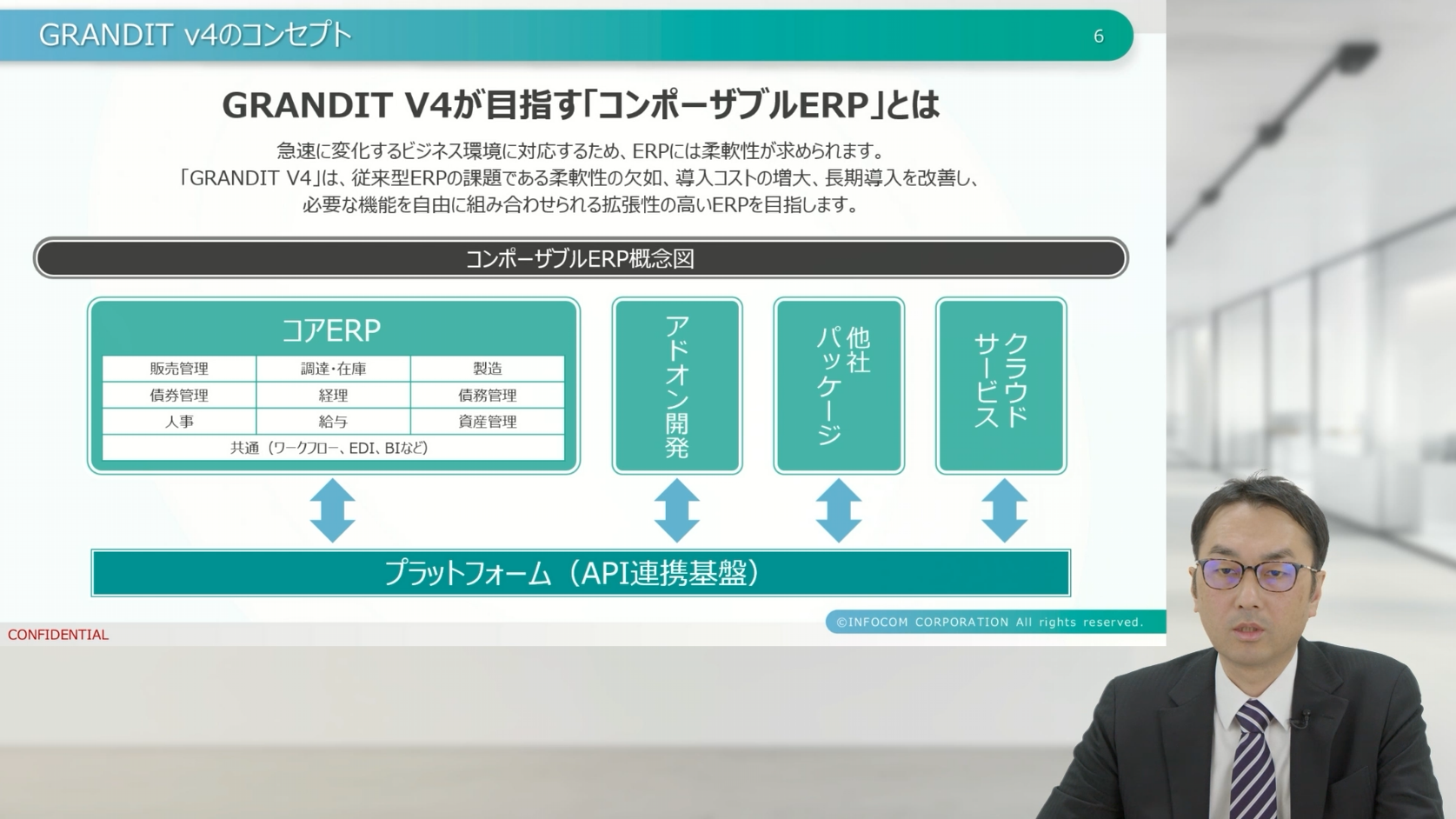 本セッションでは、インフォコム株式会社 GRANDIT事業部門 秋田より、V4の進化と今後の取り組みについて説明が行われました。急速に変化する市場環境の中で、ERPはどのような役割を果たすべきか。コンポーザブルERP「GRANDIT V4」のコンセプトと、AIを軸とした将来像が共有されました。