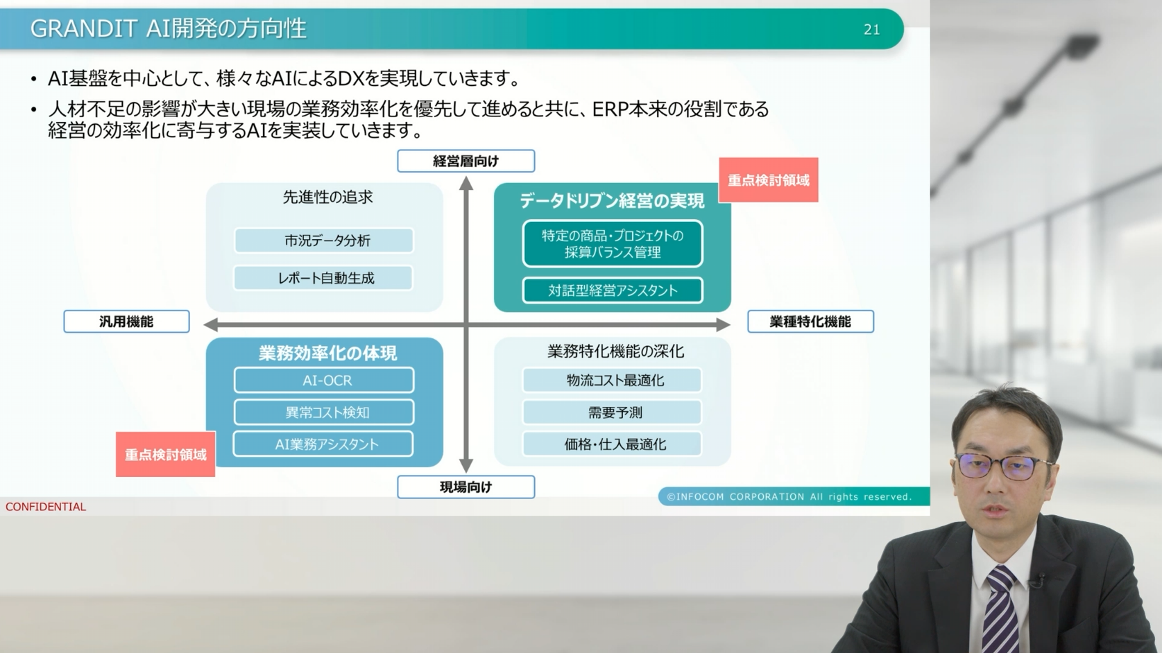 ERPメーカーであるインフォコム代表として登壇した東風平も、「プロジェクトの目的や課題を関係者間で共有しながら成功に導いた好事例である」と評価したうえで、「今後のGRANDITはAIとの連携をさらに深め、お客様のデータ利活用を強力に支援していきます」と述べました。蓄積されたデータを活かし、真のデータドリブン経営へと進化していく取り組みに、今後も注目が集まります。