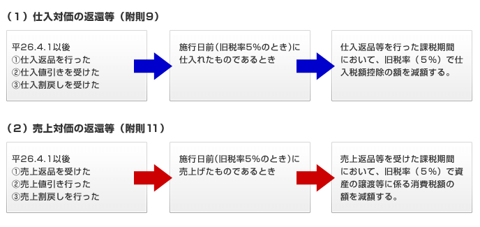 消費税率が引き上げられる施行日(平26年4月1日)前に消費税率5%で課税仕入れが行われたものにつき、施行日以後に仕入返品等を行った場合には、新税率8%ではなく、旧税率5%で、課税仕入れに係る消費税額からの控除計算を行います(附則9)。 - 売上返品等を受けた場合(売上値引きや売上割戻しを行った場合を含みます)の経過措置