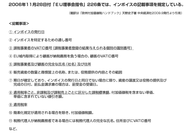 EU理事会指令(加盟国に強制力があります)では次のようにインボイスの記載事項を規定しています。