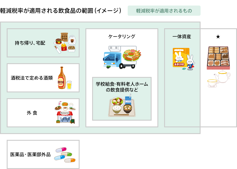 | 幼稚園や学校の給食 | 医薬品・医薬部外品・再生医療等製品 (飲食料品に該当しないため) |