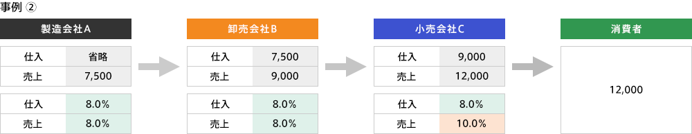 事例②の場合には、製造会社Aの売上、卸売会社Bの売上と仕入について軽減税率が適用されますが、小売会社Cの仕入については軽減税率が適用されるものの、売上については税抜販売価格が1万円を超えることから標準税率(10.0%)が適用されます。