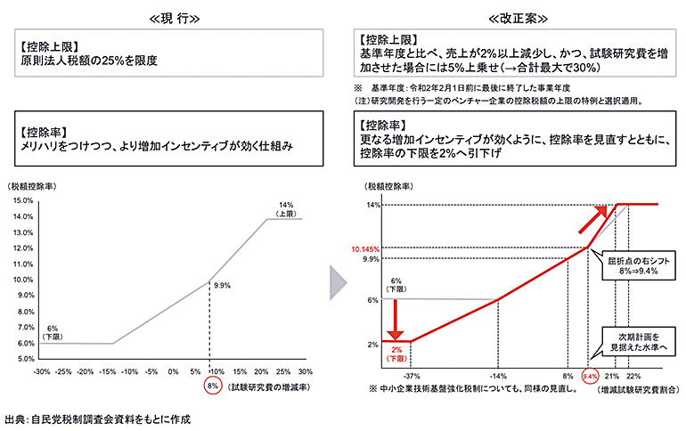 研究開発投資を増額していくインセンティブが維持されるように、コロナ禍により売上が一定程度減少したにもかかわらず、研究開発投資を増加させた企業については、控除上限を法人税額の25%から30%に引き上げるとともに、次期科学技術基本計画を見据え、控除率カーブの見直し及び控除率の下限の引下げが行われます。