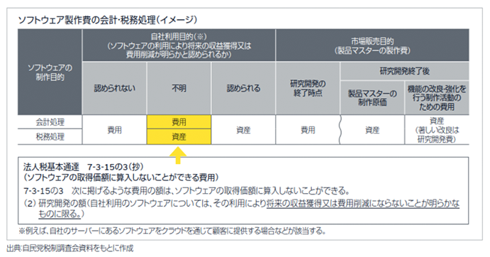 自社利用ソフトウェアの見直しについては、過年度から税制改正要望がなされており、例えば、日本機械輸出組合の令和3年度税制改正要望では「自社利用ソフトを一括りにはせず、①販売目的ソフトに準ずるソフト(サービスプロダクト、製品開発ツール)と②事務能率の改善・改良等のための自社業務用ソフト(経理・人事・総務等のシステム)とに大別し、①については、販売目的ソフトと同様「研究開発費の額」を取得価額に算入しないことができるよう、取扱いを改正頂きたい。なぜならば、販売したパッケージソフトを客先ユーザー側のPCにインストールし利用する場合は販売目的ソフトに該当し研究開発費の損金算入が認められている一方、当該ソフトと同種・類似のソフトをプロバイダー側がクラウド環境に用意し顧客ユーザーに利用いただくサービスの用に供する場合には、現状の取扱いでは自社利用ソフトに該当することとされ研究開発費についても固定資産の取得価額に算入しなければならず矛盾が生じている。」とされていました。