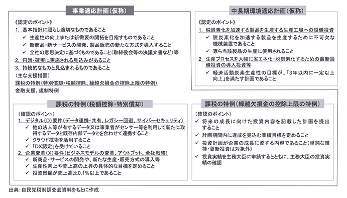 産業競争力強化法の改正案は、2021年の通常国会に提出される予定です。産業競争力強化法では、認定を受けた取組みに対して、税制優遇(DX投資促進税制、繰越欠損金の控除上限の特例、カーボンニュートラル)や金融支援等の支援措置が講じられます。上記の税制優遇を受けるためには、事前に産業競争力強化法に基づく認定が必要となります。