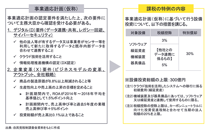 デジタル技術を活用した企業変革を進める観点から、産業競争力強化法を改正し、同法に定める事業適応計画(仮称)に従って導入されるソフトウェア等に係る投資について、税額控除又は特別償却ができる措置が創設されます。