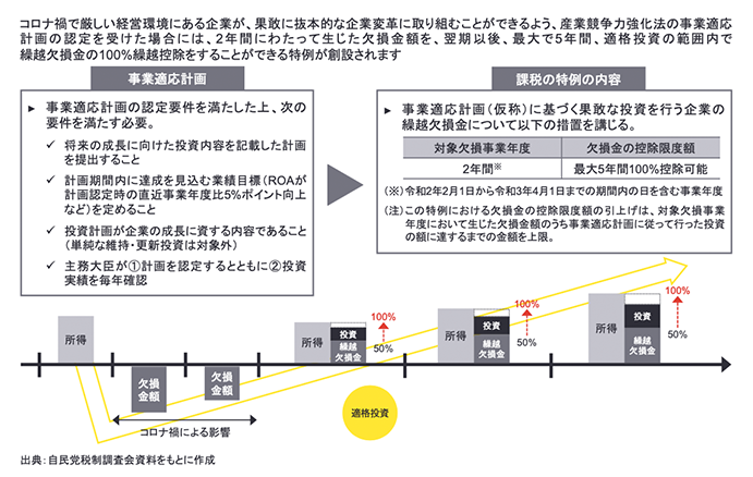 青色申告書を提出する法人で産業競争力強化法の事業適応計画の認定を受けたもののうちその事業適応計画に従って同法の事業適応を実施するものの適用事業年度において特例対象欠損金額がある場合には、その特例対象欠損金額については、欠損金の繰越控除前の所得の金額(その所得の金額の50%を超える部分については、累積投資残額に達するまでの金額に限る。)の範囲内で損金算入できる措置が講じられます。