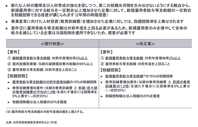 大企業向けの賃上げ及び投資の促進に係る税制の要件が以下のとおり見直され、新規雇用者の給与等の支給額及び教育訓練費の増加に着目した税制へ変更となります。
