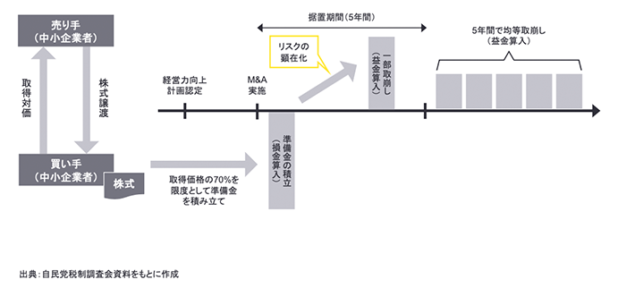 青色申告書を提出する中小企業者のうち中小企業等経営強化法の経営力向上計画の認定を受けたものが、その認定に係る経営力向上計画に従って他の法人の株式等の取得(購入による取得に限る。)をし、かつ、これをその取得の日を含む事業年度終了の日まで引き続き有している場合において、その株式等の価格の低落による損失に備えるため、その株式等の取得価額の70%以下の金額を中小企業事業再編投資損失準備金として積み立てたときは、その積み立てた金額は、その事業年度において損金算入できる措置が講じられます。