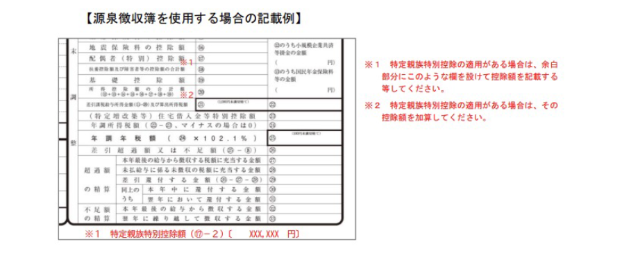 - 特定親族特別控除の適用がある場合で、当源泉徴収簿を使用するときは、源泉徴収簿の余白に「特定親族特別控除額(⑰-2)〔 XXX,XXX 円〕」と記載するなどしてください。
