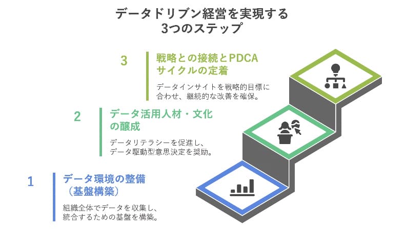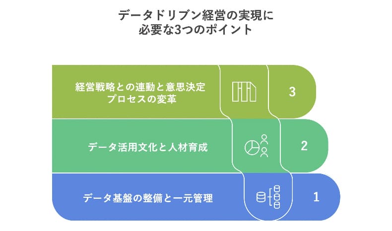 前章の4社に共通していたのは、成果を支える“土台”の存在です。データドリブン経営の実現には、以下の3つの前提条件が必要となります。