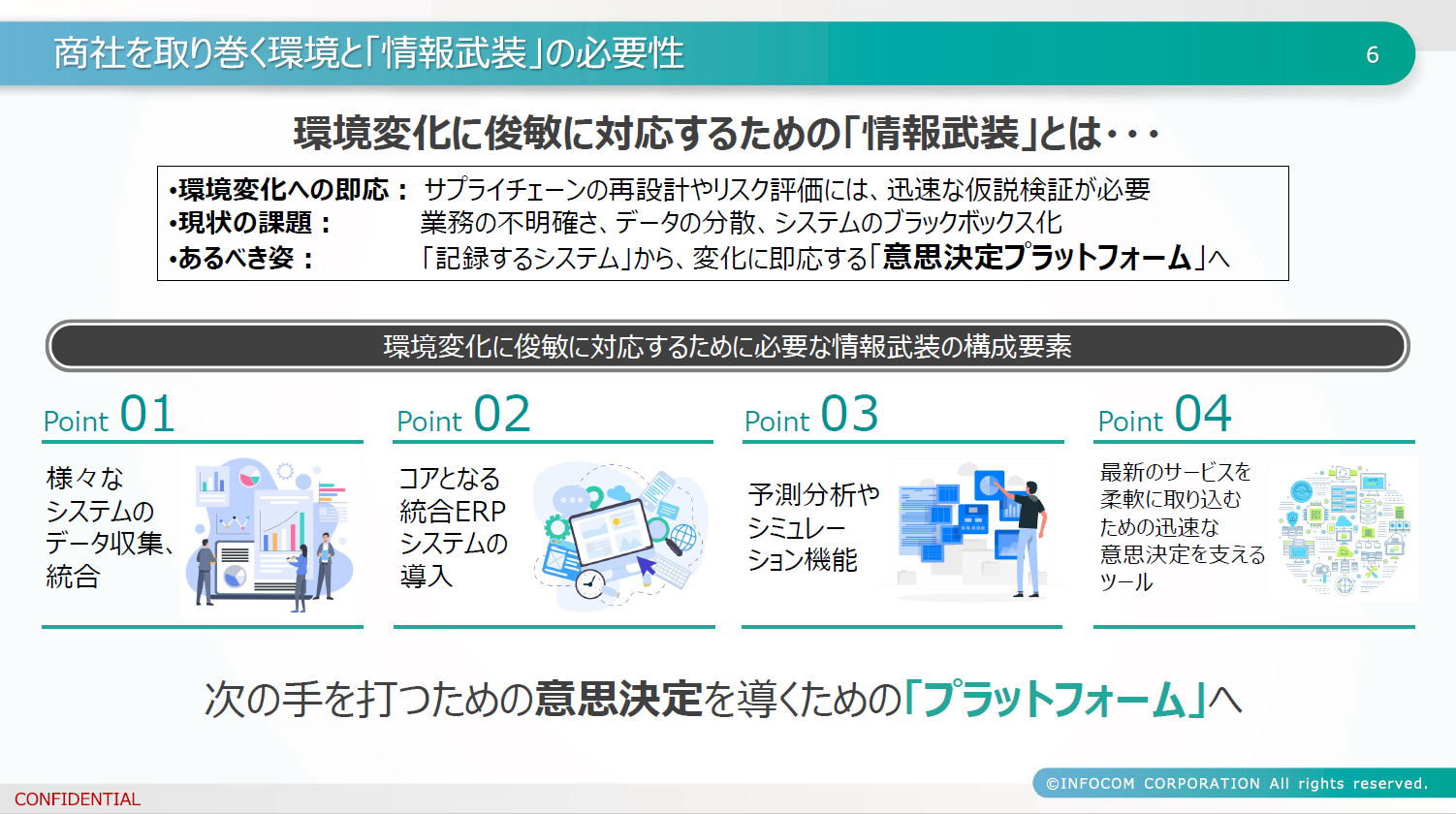 しかし現状では、業務の不明確さやデータの分散、システムのブラックボックス化が課題となっていると指摘します。そのため、環境変化に俊敏に対応するためには「情報武装」が不可欠であり、様々なシステムのデータ収集・統合、コアとなる統合ERPの導入、予測分析やシミュレーション機能、そして迅速な意思決定を支えるツールが必要であると述べました。