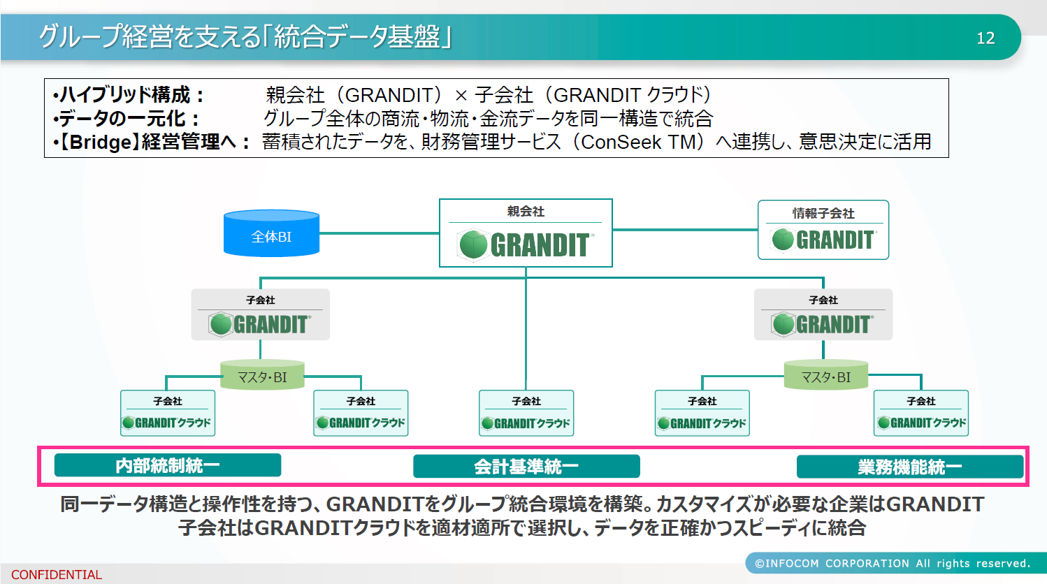 親会社はGRANDIT、子会社はGRANDITクラウドを適材適所で選択するハイブリッド構成により、同一データ構造と操作性を持つ統合環境を構築できると述べました。商流・物流・金流のデータを同一構造で統合することで、正確かつスピーディなデータ活用が可能になると説明しました。