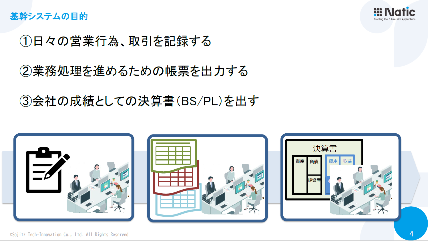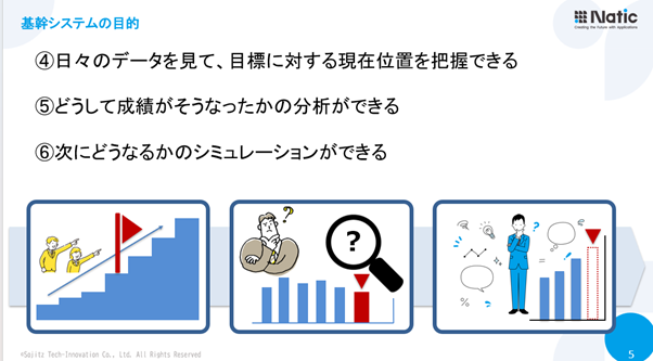 庄野氏はまず、基幹システムの本来の目的として、日々の取引記録、帳票出力、決算書作成を挙げ、これらは当然に実現できていると述べました。
