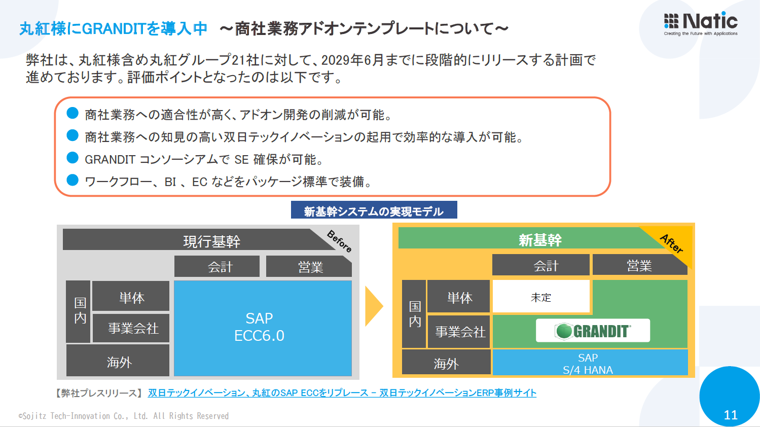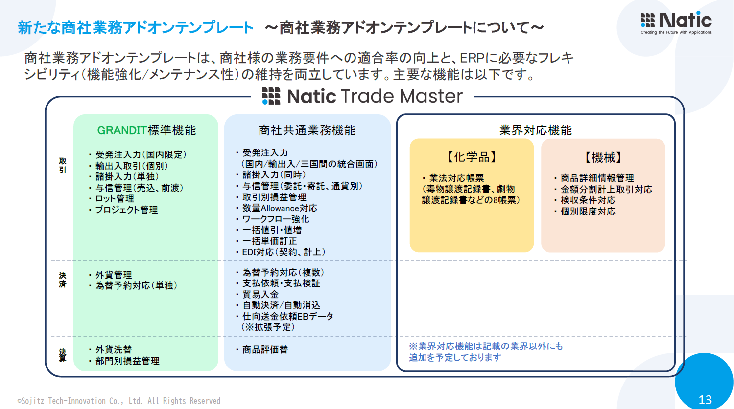 続いて庄野氏は、丸紅株式会社へ導入したGRANDITをベースに、自社のノウハウを加えて開発した、新たな商社業務アドオンテンプレート「Natic Trade Master with GRANDIT」について紹介しました。