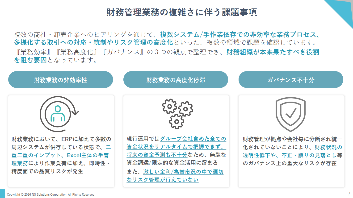 さらに、グループ全体の資金状況をリアルタイムで把握できず、将来の資金予測も十分でないことから、無駄な資金調達や限定的な資金活用にとどまっている現状を挙げました。財務管理の分断は、透明性低下や統制上のリスクにもつながると述べました。