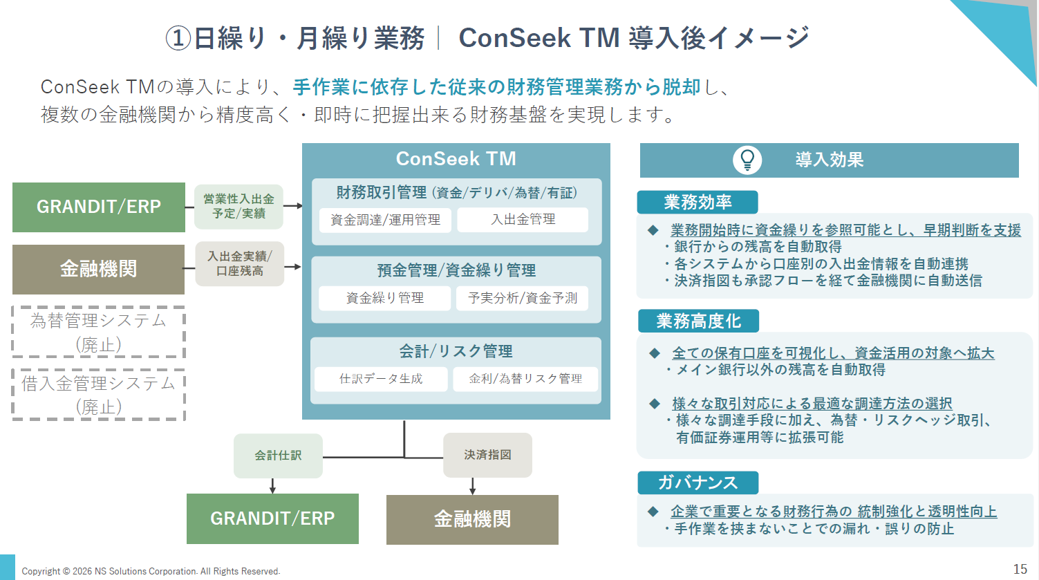 ConSeek TMは、財務取引管理、資金繰り管理、金融機関接続などを単一プラットフォームで提供し、分断されがちな財務管理業務を統合すると説明しました。銀行からの残高自動取得、入出金情報の自動連携、決済指図の自動送信により、手作業依存からの脱却を図る仕組みが示されました。
