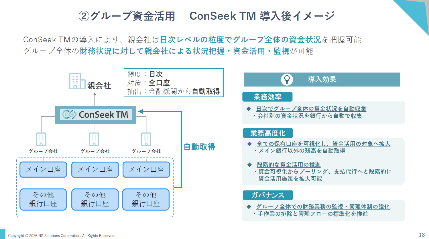 さらに、グループ会社の全口座を日次で可視化し、親会社がグループ全体の資金状況を把握・活用できる環境を整えることで、段階的な資金活用や統制強化が可能になると述べました。
