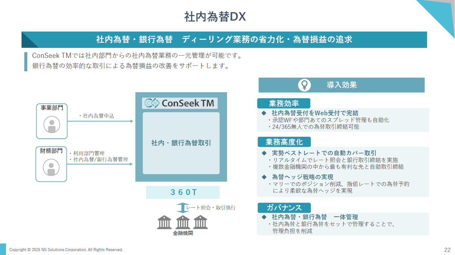 ConSeek TMでは、社内為替をWebで一元受付し、承認フローやスプレッド管理を自動化できると説明しました。複数金融機関からリアルタイムでレートを取得し、ベストレートでの自動カバー取引を行う仕組みも紹介されました。