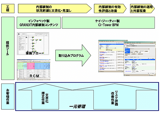 日商エレクトロニクス株式会社(本社:東京都中央区、代表取締役社長:辻 孝夫、以下:日商エレクトロニクス)、インフォベック株式会社(本社:東京都千代田区、代表取締役社長:三浦 進、以下:インフォベック)、株式会社ケイ・ジー・ティー(本社:東京都新宿区、代表取締役社長:加藤 浩、以下:ケイ・ジー・ティー)は業務提携し、内部統制文書化から運用段階の運用・評価および、次年度以降の継続運用まで一貫した支援を可能とする、内部統制ソリューション「GRANDIT内部統制コンテンツ for Ci-Tower BPM」をご提供します。