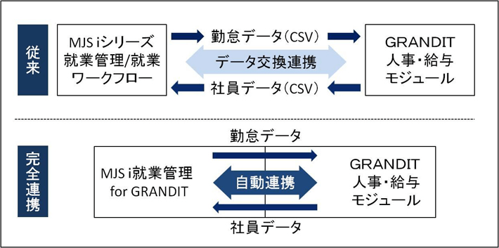 インフォベックとMJSは2009年5月に発表した「GRANDIT」の人事・給与モジュールと「MJS i シリーズ 就業管理/就業ワークフローR」との連携以来蓄積したお問い合わせ内容や導入企業様からのニーズを基に、関連法改正や多様化する就業形態への迅速な対応を可能とするとともに関連業務を効率化する勤怠データ/社員データ間の自動連携等、両者のシステム連携をより強化する事としました。