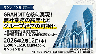 | 2026/2/12 | 【オンラインセミナー】商社・卸売業のDX推進セミナー GRANDITを核に実現!商社業務の高度化とグループ経営の可視化 | インフォコム株式会社 双日テックイノベーション株式会社 日鉄ソリューションズ株式会社 |